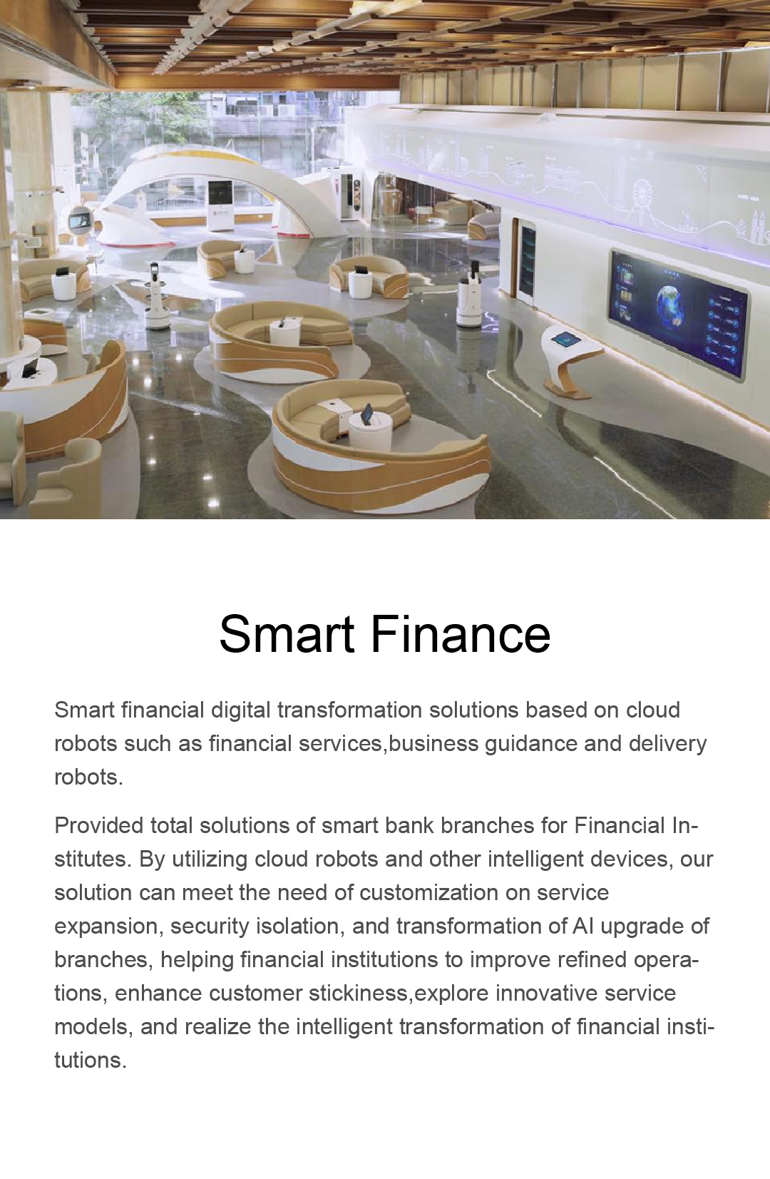 Provided total solutions of smart bank branches for Financial Institutes. By utilizing cloud robots